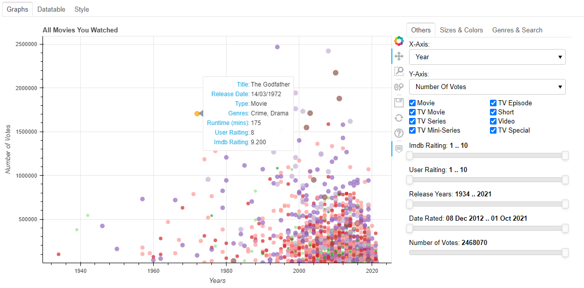 Do you like watching movies and also rate all of them in IMDB? Would you like to look at your IMDB stats based on your rated movie data? And also would like to see a bunch of graphs and tables. Come in then, this little script is for you! Made with Pandas, Bokeh. For more information, visit Github Page.